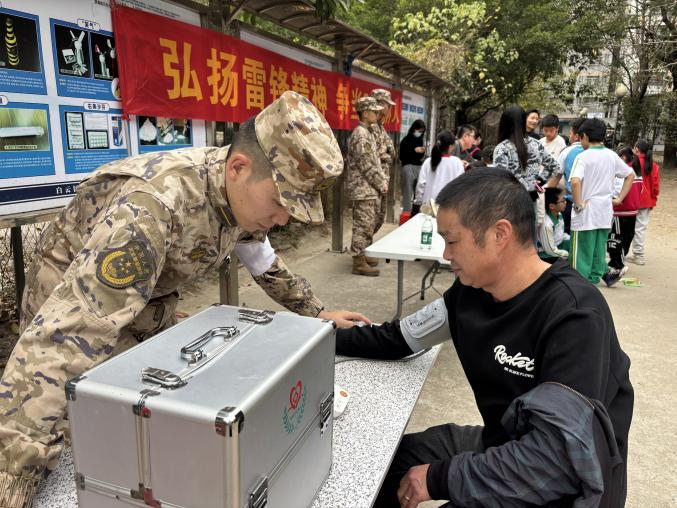 “健康义诊”专区内,军医为居民测量血压、讲解冬季保健知识,发放健康手册并耐心解答各类健康疑问;