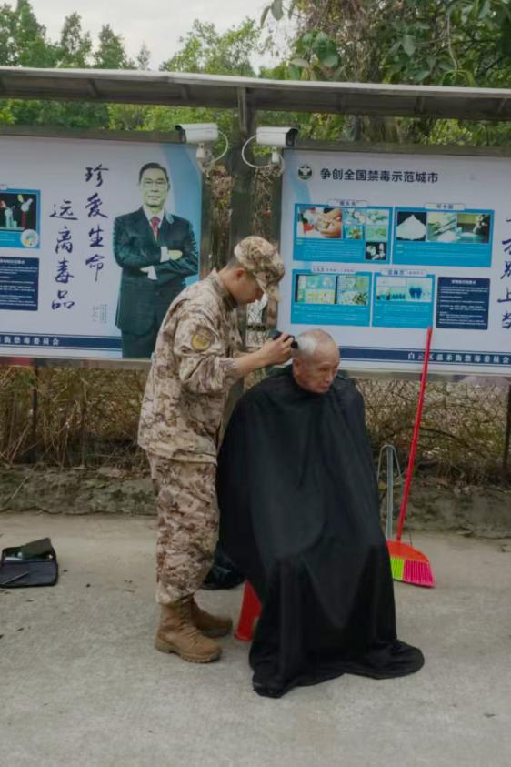 部队官兵与红棉老兵志愿者手持理发工具,细致为辖区老人、儿童修剪发型,娴熟手艺赢得现场居民阵阵称赞;
