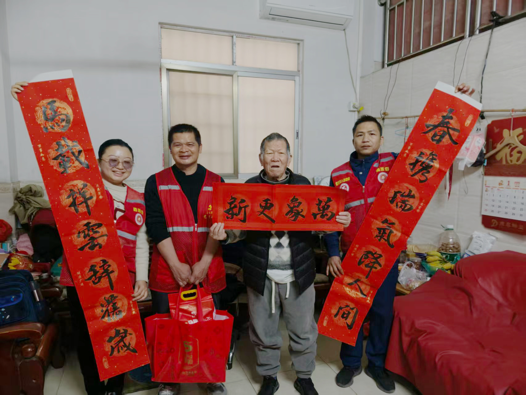 针对退役军人、军属、高龄老人及困难家庭,社区工作人员提前开展逐户走访,精准摸排服务需求、送达活动邀请,确保关怀精准落地。随后,工作人员组建“新春送福小分队”开展“敲门送福”行动,专门为高龄退役军人送上现场书写的春联,传递专属温暖。